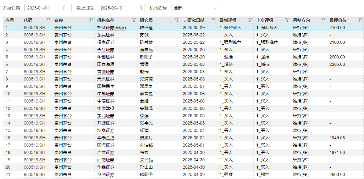 Wind显示,今年以来贵州茅台共获得92次评级,主要包括“买入”、“强推”、“增持”三大类,对比此前券商评级多维持不变。