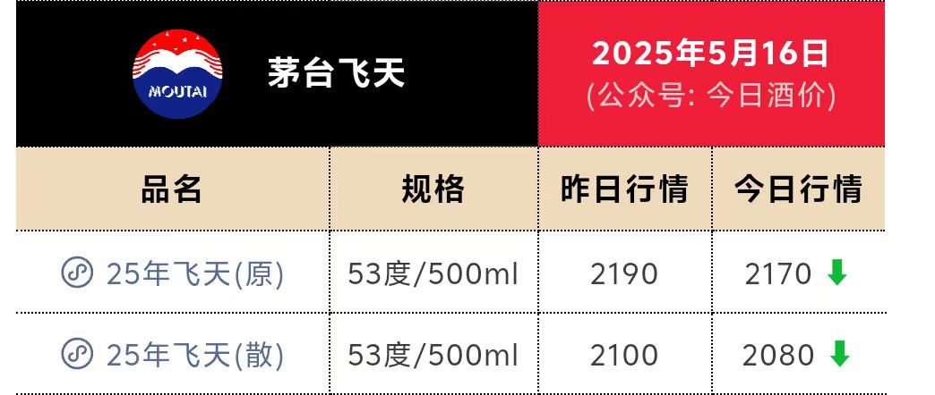 据酒业数据平台今日酒价的报价,5月16日,25年飞天茅台(53度/500ml,下同)散瓶价报2080元/瓶,原箱报2170元/瓶。